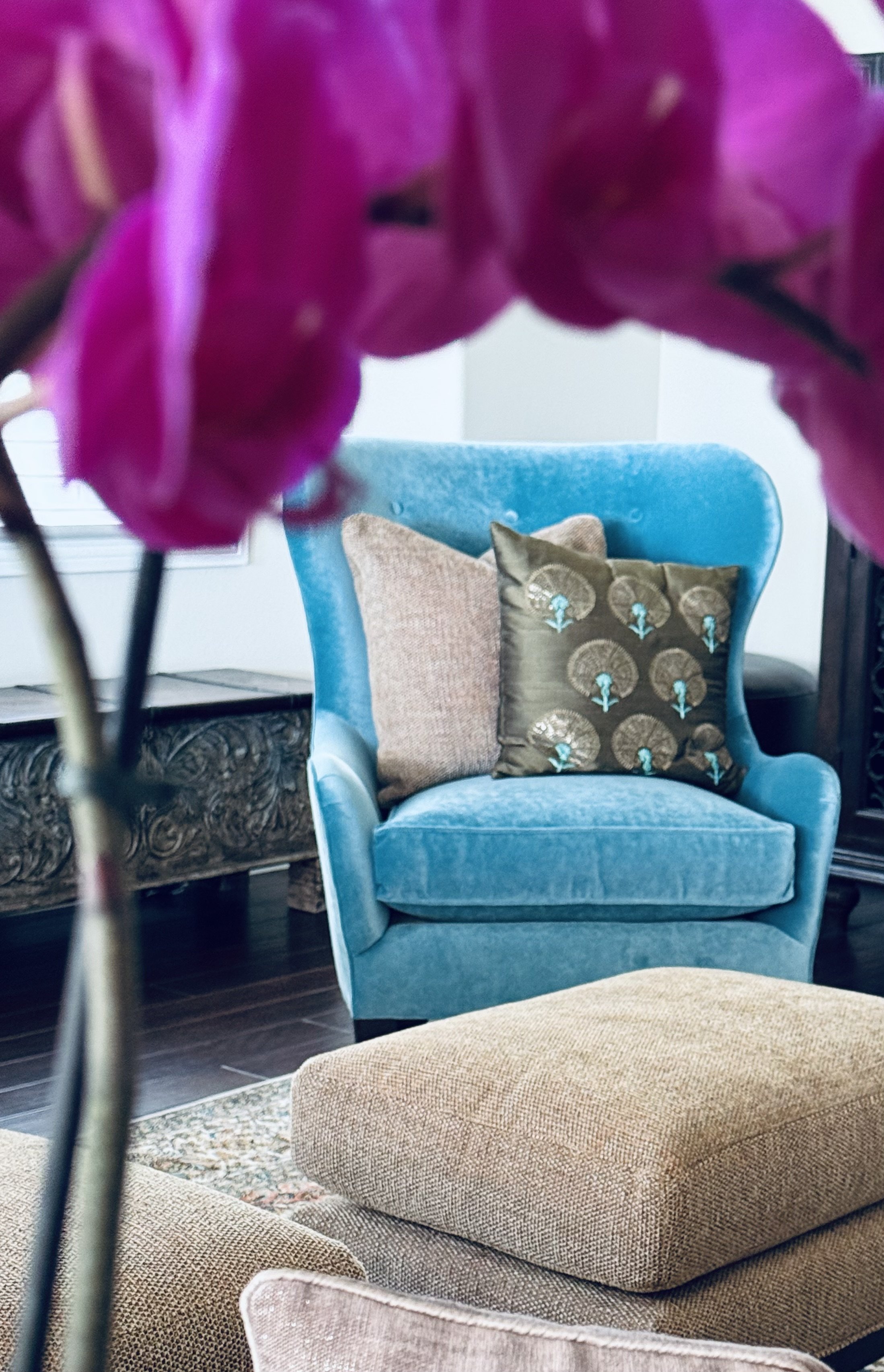 Above. A client’s home. An inviting family room. Two plush camel-colored sofas. Spice tweed ottomans. Earth’s neutral shades of sand, stone, caramel layered. Then,