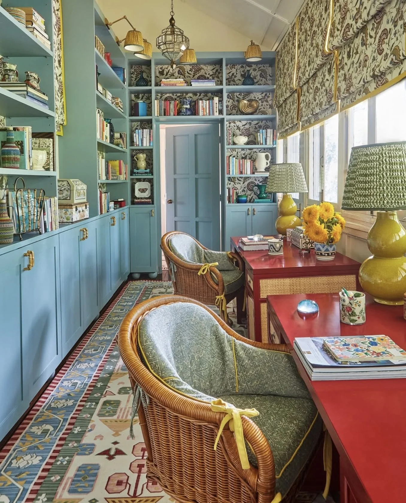 Home & Gardens Magazine, via Facebook, fed me this amazing Home Office designed by Elizabeth Hay. Color, pattern, texture; it’s a lot, I know.